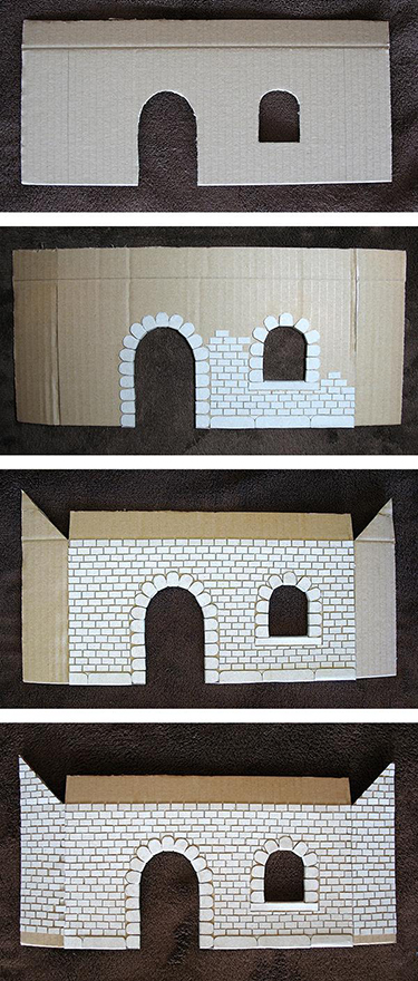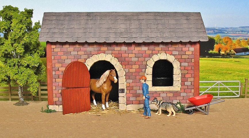 Die Fotos zeigen die einzelnen Arbeitsschritte: Für den Stall benötigt man einen größeren Karton und zwei Müslikartons. Für die Abmessungen nimmt man am besten eine Figur und ein Pferd und macht sich eine Skizze in der entsprechenden Größe (1:32 oder 1:24). Aus dem dickeren Karton werden eine Tür und ein Fenster herausgeschnitten (Bild 1). Die Steine um das Fenster und an der Basis sind aus doppeltem Müslikarton gefertigt und um die Ränder herumgeführt, so dass man die Fenster auch von der Seite ansehen kann. Für die Ziegelstein wird einfacher Müslikarton verwendet (Bild 2). Schließlich wird die gesamte Vorderfront mit Ziegeln beklebt und die beiden angedeuteten Seitenflügel für den Stall knicken und zurecht schneiden. (Bild 3+4).