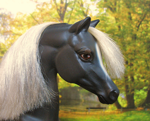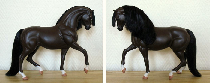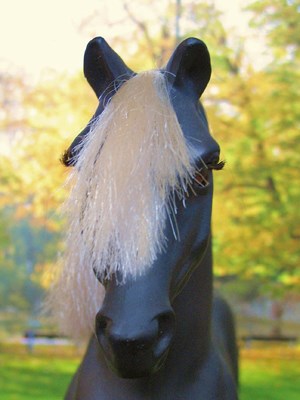 Also habe ich das Pferd neu bemalt, die dunkelbraune Farbe mit den weißen Socken sowie die Schnippe habe ich beibehalten. Allerdings hat ein Pferd im Bereich der weißen Beinabzeichen nie schwarze Hufe, ich habe die echte Naturfarbe dargestellt. Aus dem Haar der überlangen Mähne habe ich den Schweif wieder aufgefüllt und dem Kopf einen Schopf hinzugefügt.