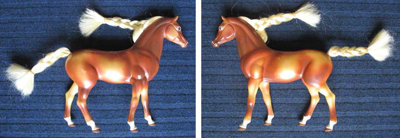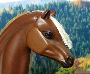 Dieses Pferd mit der kräftigen Goldmetallic-Fuchsfarbe ist das Forever Barbie Pferd von 2006. Obwohl es noch nicht so alt ist, hatte es besonders im Bereich des Sattels und an den Flanken deutliche Farbfehler. Auch die Farbverteilung der Airbrush-Farbe war nicht besonders sauber gestaltet: Siehe Ganaschen (rechts hell, links dunkel) oder Hinterbein unterhalb des Kniegelenks (rechts dunkel, links hell).