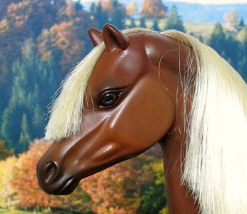 Auch den Kopf habe ich ein wenig verändert, die aufgemalten Wimpern sind verschwunden, die Augen neu bemalt, außerdem wurde die Mähne durch einen Schopf ergänzt und in ihrer Länge etwas gekürzt.