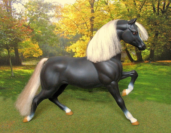 Der Vorbesitzer hat das Pferd mit Airbrush zu einem Silver dapple bay umgespritzt. Das Langhaar wurde etwas gekürzt, hat aber noch die Originalfarbe.