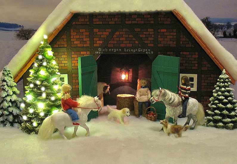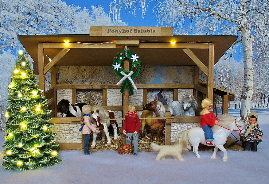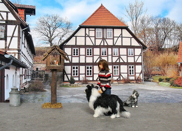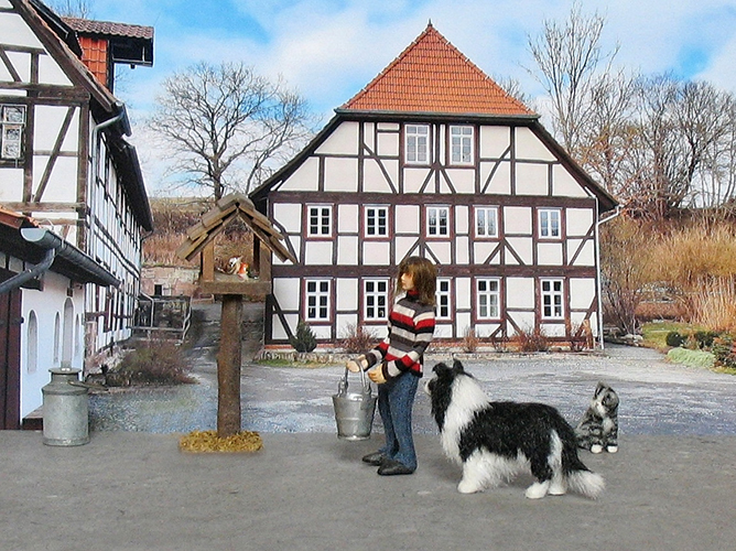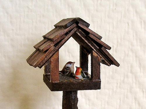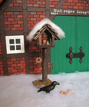 Das Vogelhaus ist noch an Vögeln erweitert worden, ich hatte die kleine Meise für den Meisenring und den Spatz auf dem Dach noch nachbestellt. Von der Verkäuferin bekam ich die beiden Vögel unten am Boden noch dazu geschenkt. Die Elster war vorher allerdings rosa eingefärbt, so habe ich da zum Pinsel gegriffen.