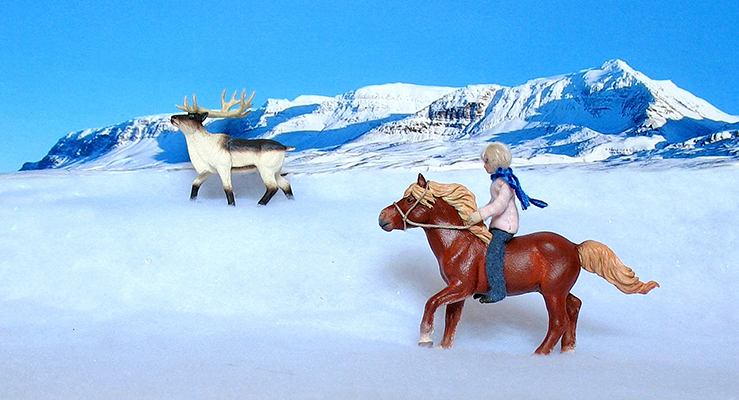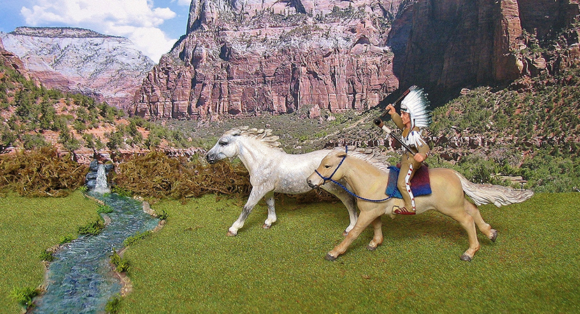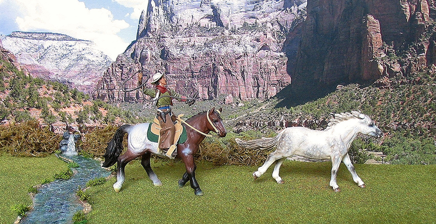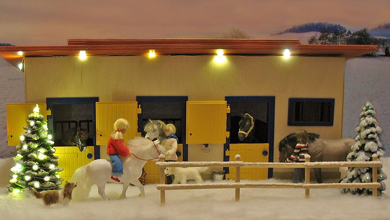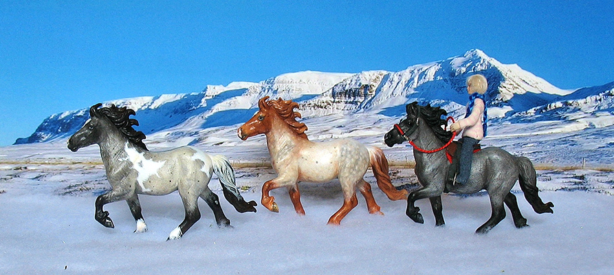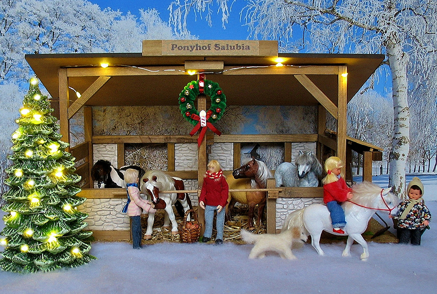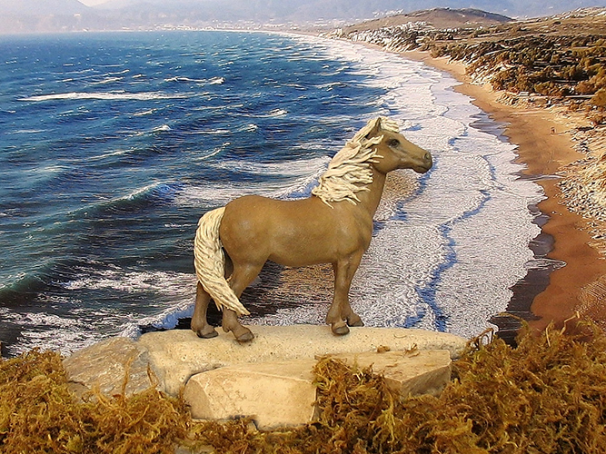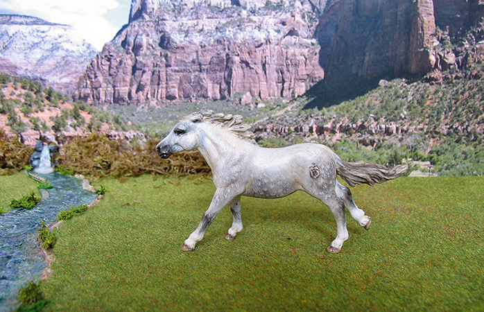 Dieses Schleich Modell aus dem Jahr 1996 wurde von Susanne K. mit Acrylfarbe und Pastellkreiden zu einem Apfelschimmel bemalt, es trägt einen Bayerischen Warmblut Brand.