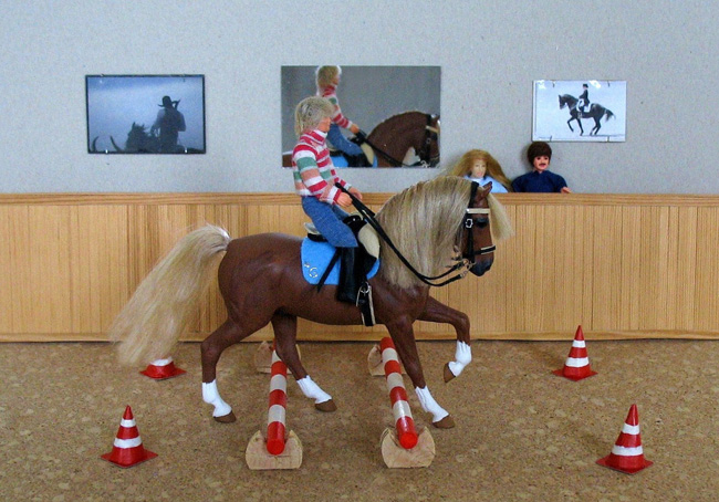 Reithalle mit Bande und Spiegel, die Hütchen und Cavaletti-Stangen sind ebenfalls selbst gemacht.