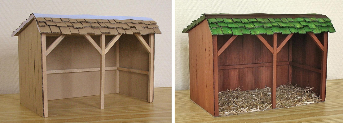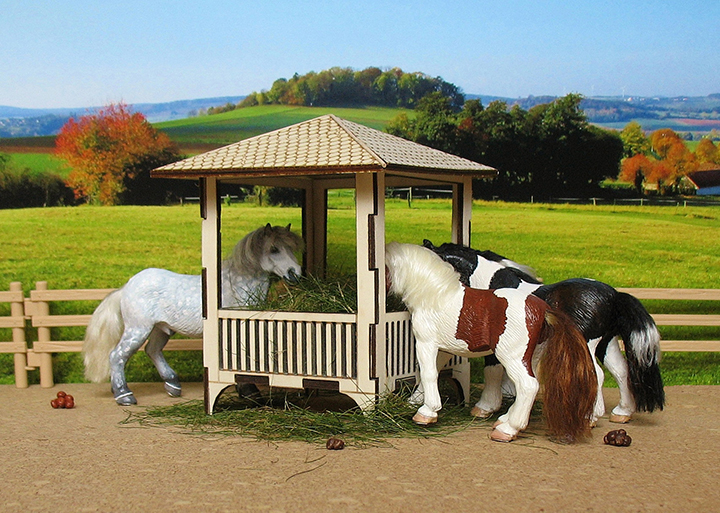 Diese Heuraufe besteht aus insgesamt neun mit dem Laser gesägten Holzteilen, die ich zusammen geklebt habe. Die vier Teile für das Dach hatten bei mir keine Schlitze zum befestigen, so habe ich sie auf Pappe aufgeklebt und die Zwischenräume mit Zahnstochern ausgefüllt. Man kann das Dach abnehmen, das erleichtert das Einfüllen des Futters.